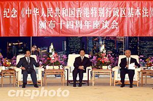 會上,中國社會科學院法學研究所所長、香港基本法委員會委員夏勇就“基本法的歷史意義和國際意義”,國務(wù)院港澳事務(wù)辦公室副主任、香港基本法委員會委員陳佐洱就“正確理解基本法規(guī)定的中央與特區(qū)關(guān)系”,港區(qū)全國人大代表王英偉就“基本法確定了行政主導型政治體制”,港區(qū)全國政協(xié)委員蔡冠深就“基本法與香港資本主義經(jīng)濟發(fā)展”,香港大學教授、香港基本法委員會委員陳弘毅就“基本法與香港的民主進程”,中央政府駐香港聯(lián)絡(luò)辦公室主任高祀仁就“貫徹落實‘一國兩制’,全面執(zhí)行基本法”等內(nèi)容先后發(fā)了言。