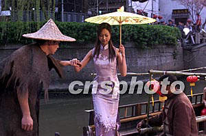 三月十四日,“古鎮(zhèn)西塘”2004年國際旅游小姐大賽中國區(qū)總決賽在西塘古鎮(zhèn)新搭建的水上舞臺進行大賽前的整體排練,三十二位參賽佳麗逐個乘坐烏蓬船登上舞臺。中新社記者:盛佳鵬