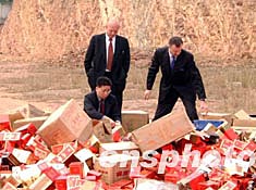 三月十五日,廣東省酒類專賣管理局在廣州從化市舉行大型銷毀假冒偽劣酒類產(chǎn)品現(xiàn)場(chǎng)會(huì),銷毀假冒高檔名酒“水井坊”、“五糧液”、“軒尼斯”、“藍(lán)帶”、“金牌馬爹里”等及假冒標(biāo)識(shí)、包裝物,共值約3500萬(wàn)元。國(guó)際洋酒協(xié)會(huì)(IFSP)董事長(zhǎng)伍國(guó)豪(左)先生等到場(chǎng)協(xié)助。作者:鄧嘉樂(lè)