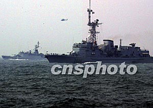 三月十六日,中法聯(lián)合軍事演習(xí)在青島某海域進(jìn)行,中法海軍協(xié)作配合戰(zhàn)術(shù)演練。中新社記者:宋吉河
