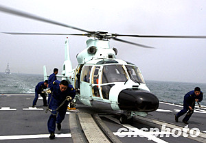 三月十六日,在青島進(jìn)行的中法聯(lián)合軍事演習(xí)中,中國(guó)海軍112驅(qū)逐艦上直升機(jī)正在迅速起飛。中新社記者:宋吉河