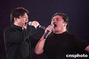 “歡歌2004演唱會”在座無虛席的首都體育館隆重上演,中國內地歌手劉歡(右)與特邀嘉賓香港歌手莫華倫一起為到場歌迷獻上了眾多耳熟能詳?shù)母枨。作?高遠