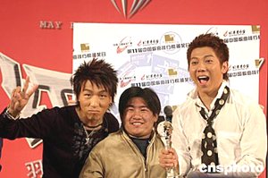 三月二十五日,羽泉組合在北京宣布,將于今年五月在北京首都體育館舉行名稱為“紅五月”的演唱會(huì)。圖為發(fā)布會(huì)上羽泉組合與歌迷一道接受中國(guó)歌曲排行榜的頒獎(jiǎng)。作者:高遠(yuǎn)