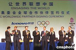 三月二十六日,聯(lián)想集團(tuán)與國(guó)際奧委會(huì)在北京簽署合作協(xié)議,宣布正式成為第六期國(guó)際奧委會(huì)全球合作伙伴(簡(jiǎn)稱TOP),這是奧運(yùn)歷史上中國(guó)企業(yè)首次獲此資格。國(guó)際奧委會(huì)市場(chǎng)開(kāi)發(fā)委員會(huì)主席海博格、北京奧組委主席劉淇、中國(guó)奧委會(huì)主席袁偉民、聯(lián)想集團(tuán)董事局主席柳傳志等出席了簽約儀式。中新社記者:武仲林