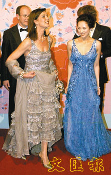 席上,章子怡獲阿爾伯特王子(Prince Albert)垂青,兩人不時(shí)以英語交談,共舞一曲。章子怡當(dāng)晚戴上總值500萬港元的耳環(huán)和手鐲,穿著一襲藍(lán)色性感晚裝,明艷照人,與嘉露蓮(Princess Caroline of Hanover)公主爭(zhēng)妍斗麗。