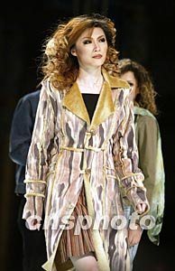 2004年—2005年秋冬流行趨勢(shì)主導(dǎo)品牌“威鵬”牛仔裝發(fā)布會(huì)三月三十日在北京國(guó)際時(shí)裝周亮相,模特展示面料講究、款式新穎的系列牛仔裝。中新社記者:毛建軍