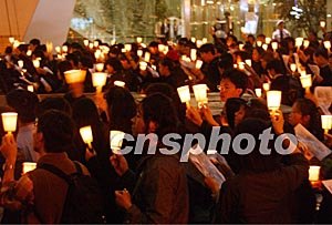 四月一日,是一代歌星張國(guó)榮逝世一周年忌日,眾多香港及海外歌迷來(lái)到文華酒店前,手舉燭光杯懷念歌星張國(guó)榮。中新社記者:錢(qián)興強(qiáng)