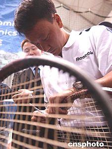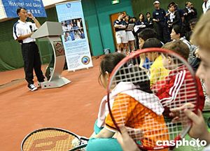 四月三日,美籍華人網(wǎng)球明星張德培應(yīng)北京和睦家醫(yī)院之約,來到嘉里健身俱樂部網(wǎng)球中心慈善演講。此次活動(dòng)的門票收入全部捐獻(xiàn)給美國教育健康基金會(huì),用于幫助中國貧困地區(qū)醫(yī)療衛(wèi)生事業(yè)和孤殘病患兒童。作者:賈國榮