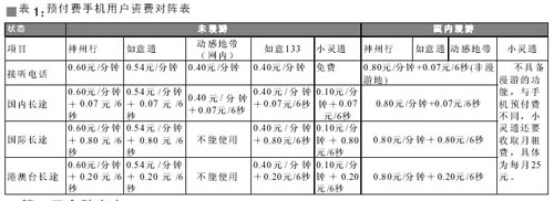 預(yù)付費(fèi)用戶分未漫游(在北京市內(nèi)使用)和漫游(在國(guó)內(nèi)其他地區(qū)使用)兩類收費(fèi)標(biāo)準(zhǔn)。具體資費(fèi)標(biāo)準(zhǔn)見表1。