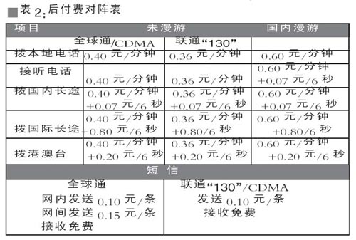 目前,包括全球通、聯(lián)通CDMA世紀(jì)133、聯(lián)通130三種后付費(fèi)業(yè)務(wù)中,130的資費(fèi)最低,為0.36元/分鐘,但是其在北京的用戶數(shù)量和信號(hào)都遠(yuǎn)遠(yuǎn)少于前兩種。