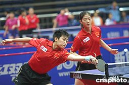 四月十二日,在北京海淀體育館進行的奧運會乒乓球亞洲區(qū)預選賽女子雙打第一階段比賽結束,中國選手郭躍(左)、牛劍鋒以不敗戰(zhàn)績進入第二階段。中新社記者:盛佳鵬