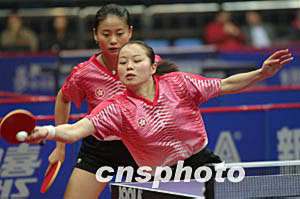 奧運乒乓球亞洲預選賽雙打比賽第二階段四月十二日晚在北京海淀體育館開賽,中國香港選手帖亞娜(前)、桑婭嬋不敵已經獲郭躍、牛劍鋒,零比四敗北。中新社記者:盛佳鵬
