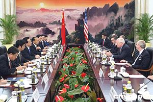 曾慶紅對切尼來華訪問表示歡迎。他說,中美都是偉大的國家,兩國存在分歧,但共同利益是第一位的。無論是在維護亞太地區(qū)和世界的和平穩(wěn)定,推動地區(qū)和全球經(jīng)濟發(fā)展,還是在應(yīng)對恐怖主義、武器擴散、跨國犯罪和疾病等方面,我們兩國都擁有廣泛的共同利益和合作基礎(chǔ),中方對近年來兩國關(guān)系取得的進展感到高興,愿與美方共同推動中美建設(shè)性合作關(guān)系繼續(xù)向前發(fā)展。