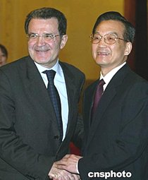 普羅迪表示完全同意溫家寶對(duì)歐中關(guān)系的評(píng)價(jià)。他說(shuō),目前歐中之間的高層互訪非常頻繁,近期將有六位歐盟委員會(huì)成員訪華,這表明歐盟對(duì)歐中關(guān)系的重視,也反映出歐盟對(duì)中國(guó)的發(fā)展抱有充分的信心。