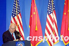 應(yīng)邀來華訪問的美國副總統(tǒng)理查德切尼,四月十五日在上海復(fù)旦大學(xué)演講。作者:湯彥俊