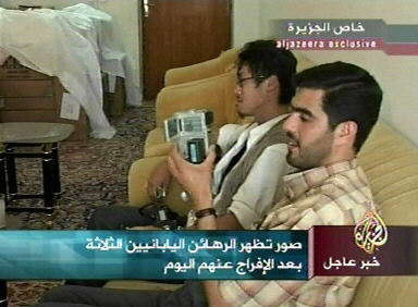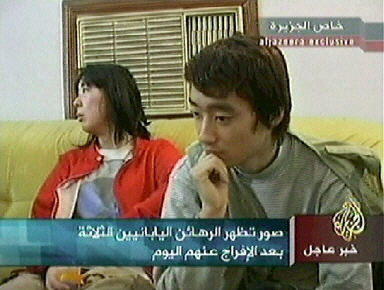 據(jù)報道,被釋放的3名人質(zhì),目前在伊拉克穆斯林長老會的保護(hù)下健康狀態(tài)良好。該電視臺播放了3名人質(zhì)的圖像。被釋放的3名人質(zhì)分別為自由撰稿人今井紀(jì)明(18歲,札幌市西區(qū))攝影記者郡山總一郎(32歲,東京都杉并區(qū))和志愿社會活動家高遠(yuǎn)菜穗子(34歲、北海道千歲市)。
