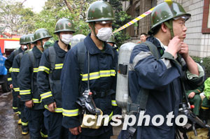 重慶市天原化工總廠門外整裝待發(fā)的消防隊員。十五日晚,該廠發(fā)生氯氣泄漏事故,有十五萬人撤離。作者:鄒輝