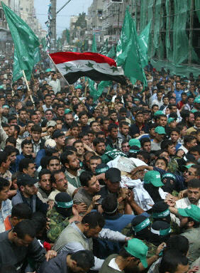 3月22日,近萬名哈馬斯的支持者和巴民眾涌上加沙街頭,為遭以軍暗殺的“哈馬斯”精神領(lǐng)袖亞辛舉行葬禮,更抗議以色列不光彩的暗殺。28天后,巴勒斯坦各武裝派別的支持者們又來給蘭提斯送行。當(dāng)他們擁著蘭提斯的尸體,鳴著槍從加沙師法醫(yī)院走向阿爾納斯郊區(qū),他們心中充斥的是憂傷?是憤怒?是恐懼?還是茫然?
