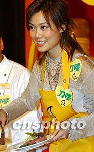 四月十九日,香港一商家舉行產(chǎn)品促銷活動,為商家作電視廣告并唱主題歌的歌星容祖兒在活動上展示廚藝。中新社記者:錢興強