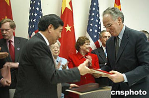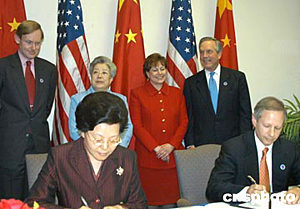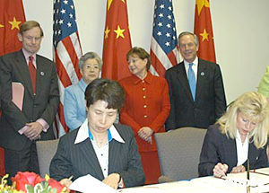 中美在四月二十一日結(jié)束的第十五屆中美商貿(mào)聯(lián)委會上,就“高技術(shù)出口最終用戶訪問”達(dá)成協(xié)議,這將推動(dòng)美國對華高科技出口。圖為中國商務(wù)部副部長馬秀紅(左)與美國商務(wù)部副部長杰斯特(右)在簽字。作者:余東暉