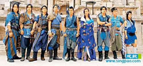 中新網(wǎng)4月22日電 據(jù)香港成報報道,九位百事巨星云集安曼古城,各自穿上古裝一字排開,氣勢十足。站在中央的依然是百事老大哥郭富城,天后鄭秀文站在他身旁,F(xiàn)4的少俠打扮各有特色,cool味十足,而周杰倫與蔡依林被陳冠希分隔開。九人的造型都是以藍色為主,周杰倫還扎上長辨,令人甚為新鮮。