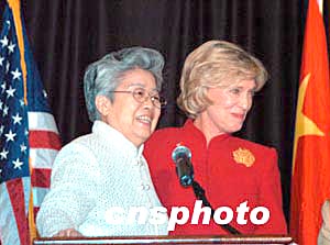 中國副總理吳儀22日晚上向美國政界工商界發(fā)表入情如理的演講,受到好評。演講后,主持人、美國美國前商務部長芭芭拉.富蘭克林(右)稱贊吳儀演講“沒有一句廢話”。中新社記者:余東暉