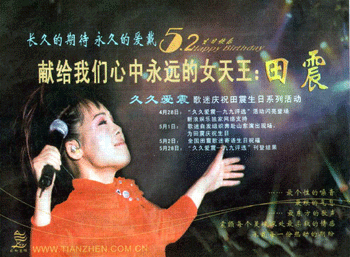 作為國(guó)內(nèi)首次歌迷自發(fā)集資為偶像購(gòu)買生日廣告的發(fā)起者,田震歌迷會(huì)的會(huì)長(zhǎng)張寧寧向記者介紹了他們的想法!斑@是我們一年前的想法了,整個(gè)廣告也都是我們歌迷會(huì)的成員自己設(shè)計(jì)的。”對(duì)于田震近一兩年的低調(diào)表現(xiàn),始終擁護(hù)她的歌迷不甘心自己的偶像沒有音訊,因此他們決定在田震2004年生日到來的時(shí)候,用一系列的特別舉動(dòng),為偶像造勢(shì)!百I廣告位只是我們系列慶祝活動(dòng)中的一項(xiàng),我們還與門戶網(wǎng)站新浪合作,推出‘久久愛震-九九評(píng)選’活動(dòng),大家還要在5月1日自發(fā)趕赴田震當(dāng)天在山東聊城的演出現(xiàn)場(chǎng)高舉生日快樂的橫幅為她慶祝等!