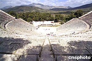神話、史詩(shī)、戲劇是古希臘的重要文明,伯羅奔尼撒半島東南方的埃庇達(dá)洛斯劇場(chǎng)為公元前四世紀(jì)所建,呈圓扇面形,共有55層座位,每層兩階梯,可容納14000人。其音效奇佳,在圓心處低語(yǔ)或掉下一塊銅幣,坐在最后一排也能聽(tīng)得真切。作者:田地
