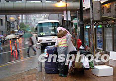 5月8日,香港天文臺(tái)上午7時(shí)20分一度發(fā)出今年首個(gè)黑色暴雨警告,歷時(shí)40分鐘。雖然黑色暴雨警告生效,但一名清潔工在街頭仍然工作。作者:譚達(dá)明