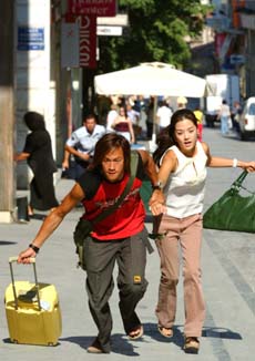 這場驚心動魄的追逐戲在雅典市中心憲法廣場拍攝,由于現(xiàn)場人潮擁擠,許多人根本不曉得在拍戲,加上何潤東與蔡琳拎個大卡行李箱,活像對亡命鴛鴦,引起很多路人側(cè)目。
