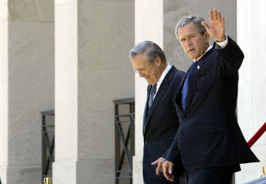 布什稱贊拉氏說,拉姆斯菲爾德在美國進(jìn)行的反恐戰(zhàn)爭中領(lǐng)導(dǎo)有方,他的表現(xiàn)杰出,是強(qiáng)有力的國防部長,當(dāng)?shù)闷鹈绹嗣竦母兄x。