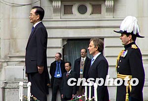 當(dāng)?shù)貢r間五月十日,英國首相布萊爾舉行儀式歡迎中國總理溫家寶。作者:朱大強(qiáng)