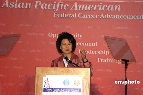據(jù)介紹,目前亞太裔雇員人數(shù)占美國聯(lián)邦政府雇員總數(shù)的百分之四點八,他們當中的百分之三點二擔任主管級職位。布什政府在其十六位內(nèi)閣部長中,任命了華裔趙小蘭為勞工部長,日裔峰田為運輸部長,另外還有一百六十多人在布什政府中擔任高級職位,僅勞工部就有二十名亞太裔正在或曾經(jīng)擔任高級職位。