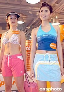樂(lè)壇新星官恩娜(右)、歌星陳見(jiàn)飛5月12日在香港出席全港最大的運(yùn)動(dòng)專門店GigaSports SuperStore開(kāi)幕,兩人客串模特展示最新泳裝。