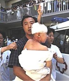 北京大學第一醫(yī)院幼兒園十五名兒童和三名教師二00四年八月四日上午九時左右在幼兒園被人持菜刀砍傷。其中一名重傷兒童經(jīng)搶救無效死亡。犯罪嫌疑人是該幼兒園一名五十一歲的臨時工。北京警方透露,兇嫌有精神病史