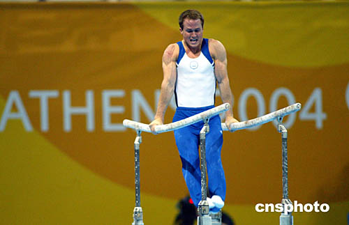在當?shù)貢r間8月18日舉行的男子體操個人全能賽中,美國選手哈姆奪得冠軍。圖為他在雙杠項目上的表現(xiàn)。