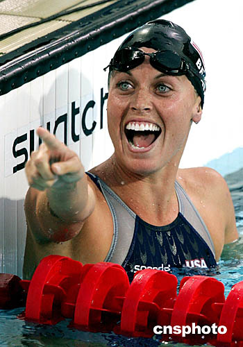 在當(dāng)?shù)貢r(shí)間8月19日舉行的女子200米蛙泳比賽中美國選手阿曼達(dá)-比爾德勇奪金牌。圖為她在得知自己奪冠后歡呼的鏡頭。