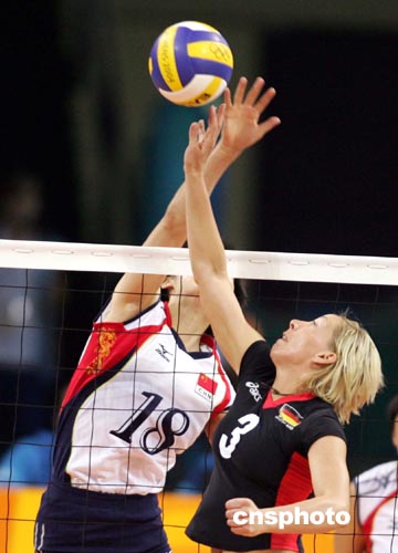 中國(guó)女排當(dāng)?shù)貢r(shí)間八月二十日上午在雅典奧運(yùn)會(huì)排球比賽中以三比零戰(zhàn)勝德國(guó)隊(duì)。中新社記者:毛建軍