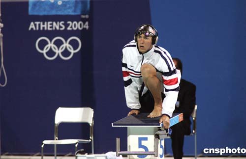 圖為當(dāng)?shù)貢r間8月19日,美國游泳選手菲爾普斯參加男子200米混合泳時登上跳臺的情景。