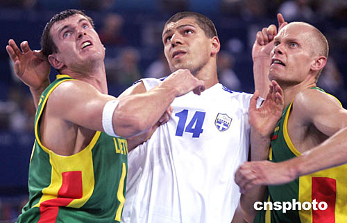 在當(dāng)?shù)貢r間8月19日舉行的男子籃球賽中,14號希臘選手Lazaros Papadopoulos被立陶宛兩名選手防住,很難脫身。