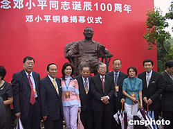 來自五大洲三十一個國家的百余名海外華僑華人,今天上午在雨中參觀“小平故里”紀(jì)念園。在新近揭幕的鄧小平銅像前,僑領(lǐng)們興致勃勃,或打著傘或淋著雨,紛紛與面帶微笑、坐在藤椅上的小平銅像合影。