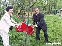 今天上午,“華僑林”留芳碑揭彩儀式后,僑領(lǐng)們紛紛提起水桶為一棵棵木澆水。圖為一對僑領(lǐng)夫婦在澆水。
