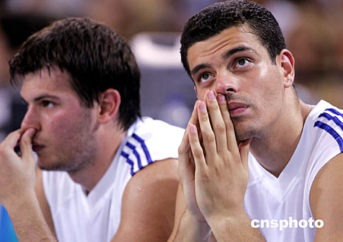 在當(dāng)?shù)貢r(shí)間8月19日進(jìn)行的男子籃球比賽中,希臘隊(duì)以76比98不敵立陶宛。圖為希臘隊(duì)員露出無奈的表情。