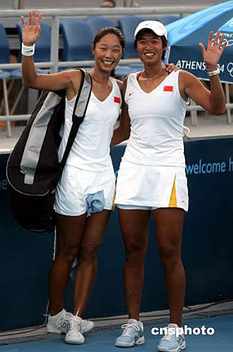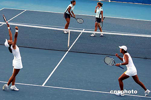 雅典當(dāng)?shù)貢r(shí)間8月20日傍晚,中國(guó)網(wǎng)球選手孫甜甜、李婷(前)在半決賽中以九比七戰(zhàn)勝阿根廷選手,歷史性地闖入奧運(yùn)會(huì)女子網(wǎng)球雙打決賽。中新社記者:任晨鳴