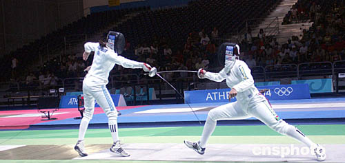 圖為在當(dāng)?shù)貢r(shí)間8月20日舉行的女子擊劍比賽中,希臘選手和南非共和國選手展開激烈對攻。
