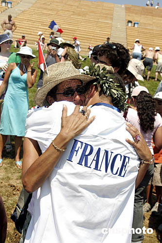 在當(dāng)?shù)貢r間8月20日舉行的急流回轉(zhuǎn)男子單人皮艇決賽中,法國選手勒弗維里獲得銅牌。圖為他與自己的母親互相擁抱慶祝勝利的畫面。