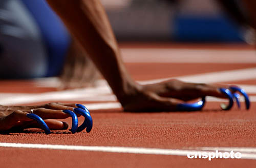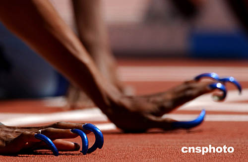 美國“女飛人”蓋爾-德弗斯第五次出征奧運會,她曾在25屆和26屆奧運會上連續(xù)贏得100米短跑金牌。圖為她的那個起跑前獨一無二的預(yù)備動作——用手背貼地而彎起長長的美麗指甲。