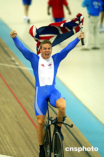 圖為在當(dāng)?shù)貢r間8月20日舉行的男子自行車1公里計時賽決賽后,奪冠的英國選手豪伊(Chris Hoy)高舉國旗歡呼勝利的場面。