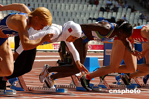 圖為在當(dāng)?shù)貢r(shí)間8月20日舉行的女子100米比賽中,巴林選手Rakia Al Gassra包著頭巾穿著長(zhǎng)袖長(zhǎng)褲與別的選手形成鮮明對(duì)比。