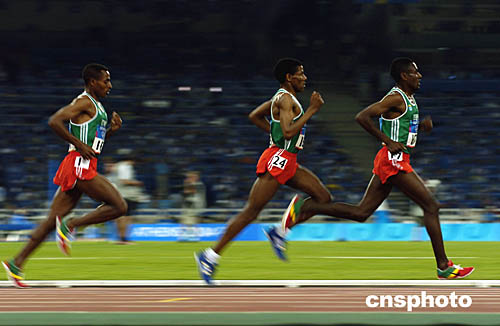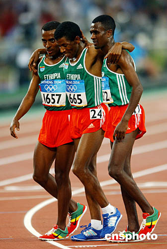 圖為在當?shù)貢r間8月20日舉行的男子1萬米比賽中,埃塞俄比亞選手所向披靡,一路領先。最后貝克勒輕松奪冠,并打破該項目的奧運會記錄。